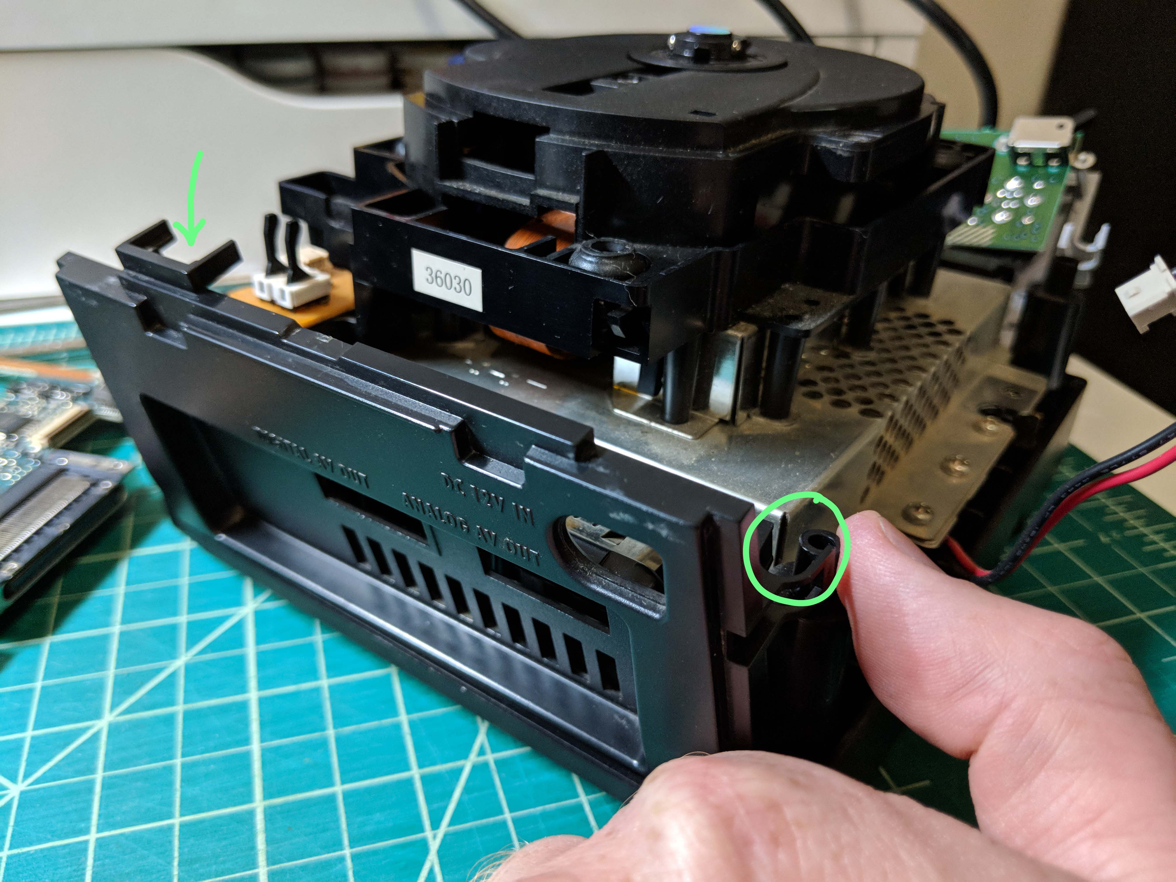 Pull forward on the tabs on either side of the controller port panel, then carefully pull the FFC cable out from the motherboard to free the cover. Set it aside. Note: the drive assembly was already removed in the second picture. Don’t worry about that yet.