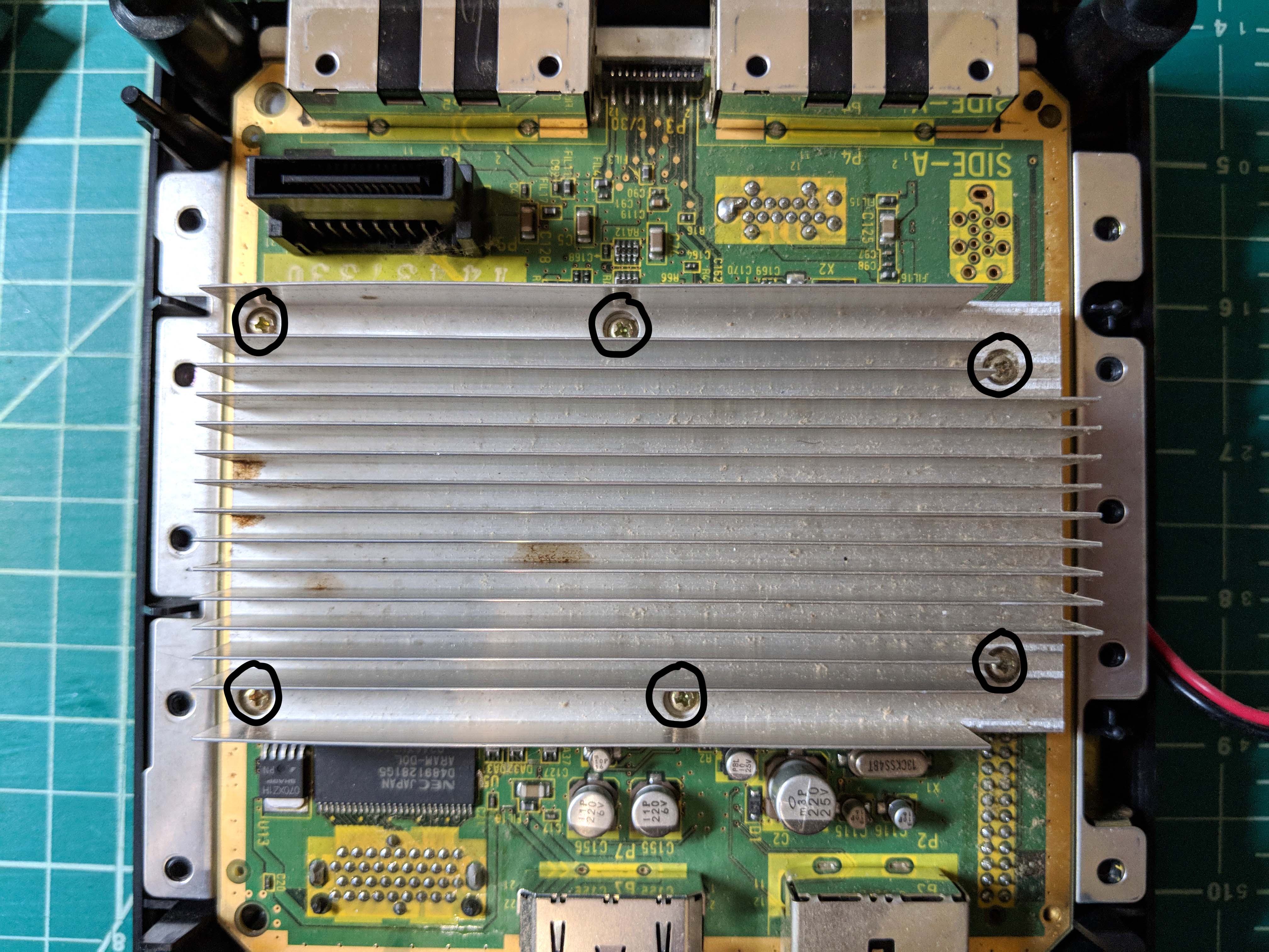 There are six screws securing the heatsink to the ground plate under the motherboard. Remove these screws, but leave the heatsink in place unless you need to work under it (the thermal pads will keep it from falling off). Pull up on the motherboard to remove it from the chassis.