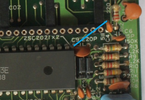 The idea with this mod is to disconnect the stock oscillator circuit and inject the dejitter mod in its place (though not literally in the case of the NES as it is injected on the NESRGB side of things instead). The oscillator circuit lives between pin 29 of the CPU and pin 18 of the PPU. In the case of the original Famicom, there are capacitors on either side that connect those pins to the circuit. For the toploader, the pins connect through a single capacitor.