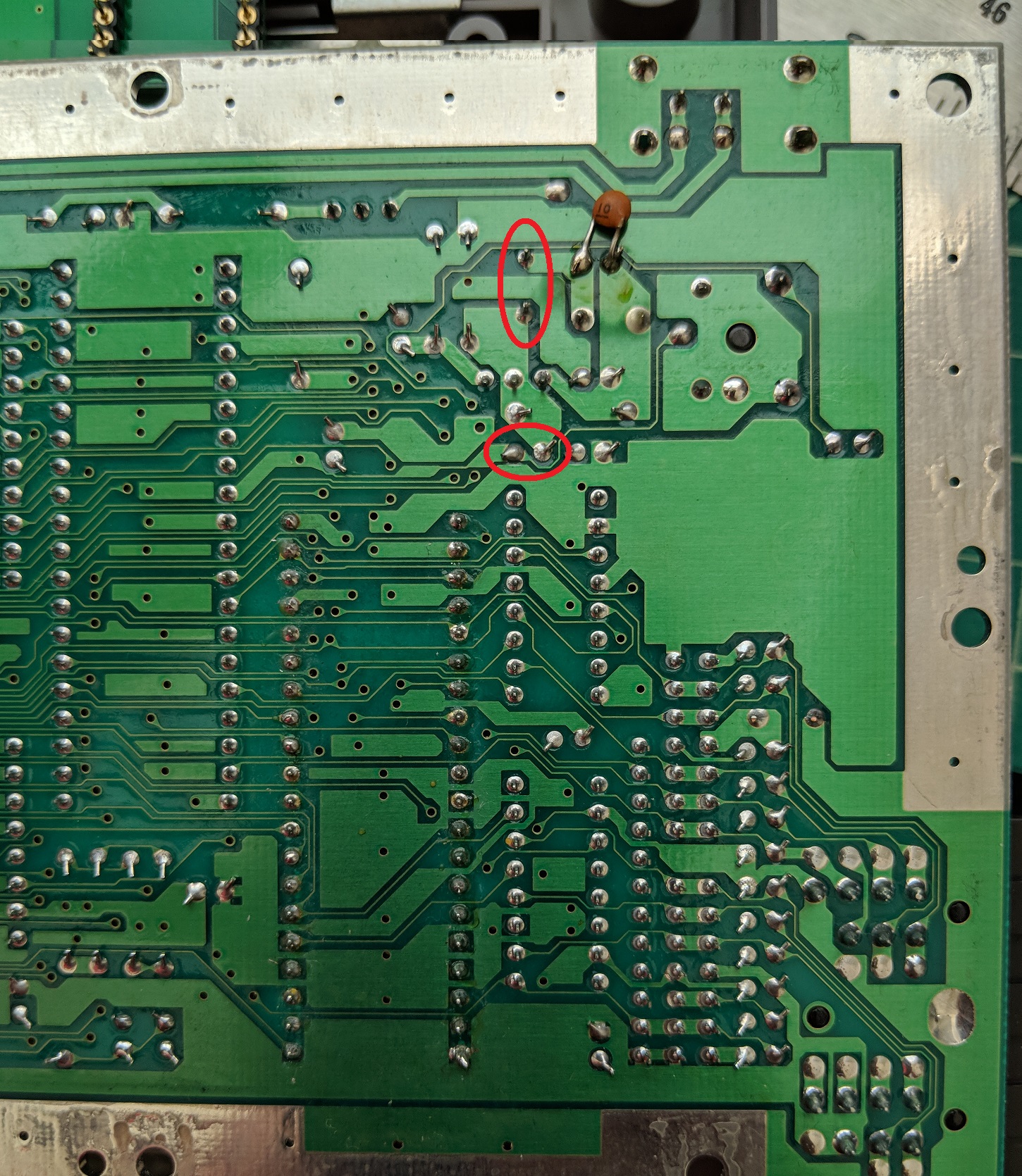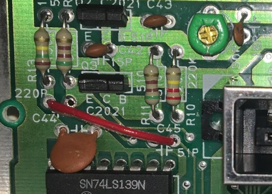 Connect a jumper wire between the outside pads of C4 and C9. This picture shows where to connect the jumper (ignore the capacitors since you will have removed them).