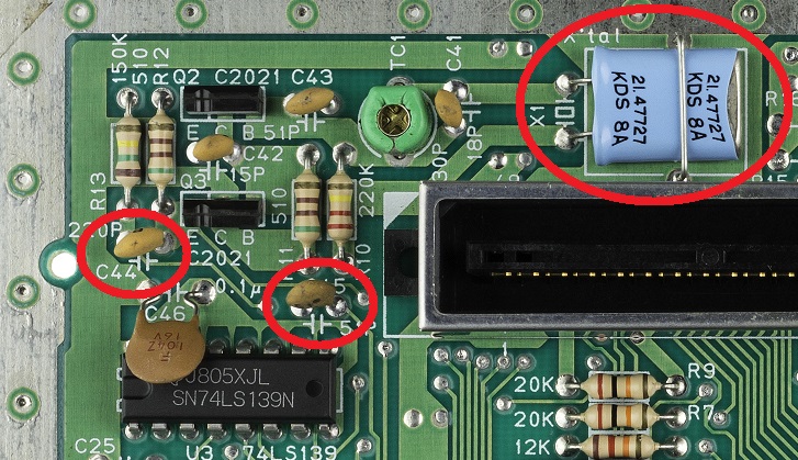 Set up the dejitter board as in the general procedure above, then remove C44, C45, and X1 from the NES motherboard.