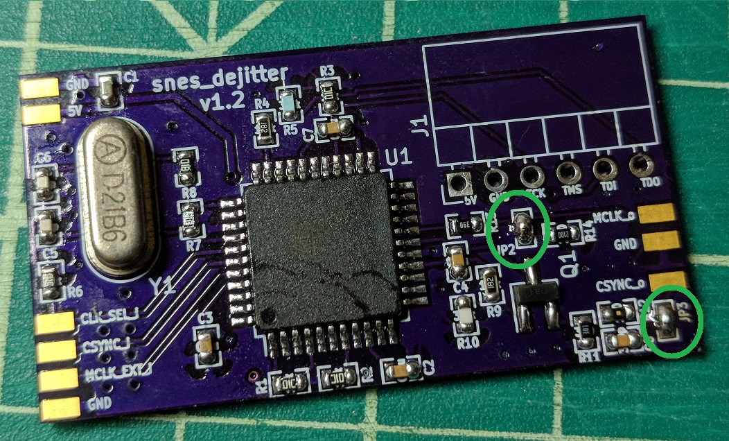On the dejitter PCB, close jumpers JP2 and JP3. I find that a slightly thicker solder works best for this. You may also want to flow a bit of solder onto the other pads at this point.