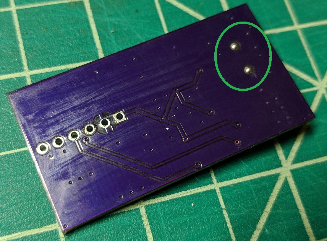 Flip the PCB over and trim the leads of the oscillator using the flush cutters so that they will not poke through the tape. I also reflowed the solder so I would get a smooth surface.
