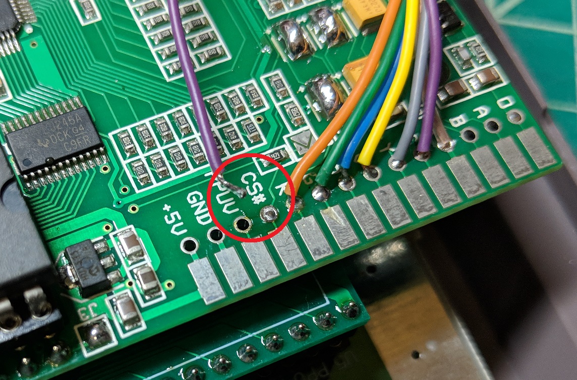 These are the locations to connect the remaining wires from the dejitter board. You can also put the wires in the holes if you prefer. CS# connects to CSYNC_i, GND connects to GND, and +5V connects to 5V.