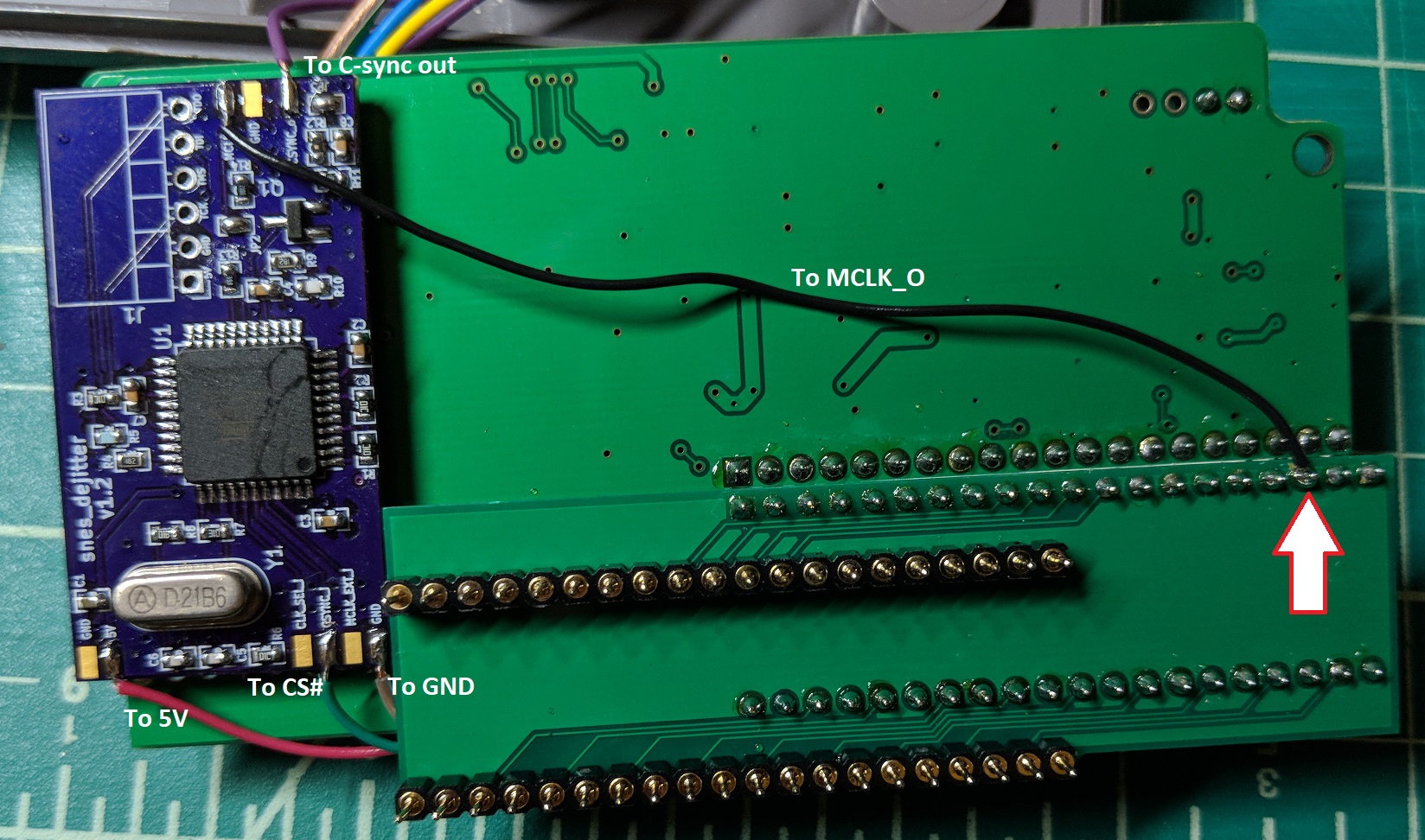 Solder the c-sync wire you removed earlier to the CSYNC_o pad on the dejitter board. MCLK_o connects to the CLK pin on the PPU (the third pin in from the right as indicated). I found it easiest to remove some solder from the pin, wrap the wire around it, then resolder it all together. Also solder wires to the 5V, CSYNC_i, and GND pads on the dejitter board. These will be connected to the top side of the NESRGB.