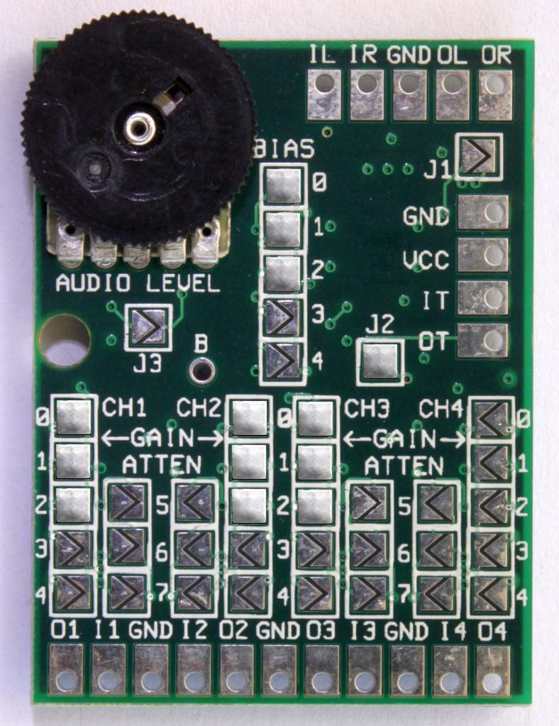 Before even opening the console, set the jumpers on the AV Driver as shown. J1 and J2 are used for setting sync, so you only need to worry about these if you will be using c-sync instead of composite video as sync. J1 is left open since the sync input is lower than TTL level and J2 is closed to provide 75-ohm sync at the output. J3 is left open to enable audio pop suppression, which helps protect your equipment. Finally, the gain and bias jumpers must match, so close the 0, 1, and 2 jumpers for each to get proper signal video signal levels. Note that only three of the four video channels are used, so the remaining jumpers can be left open.