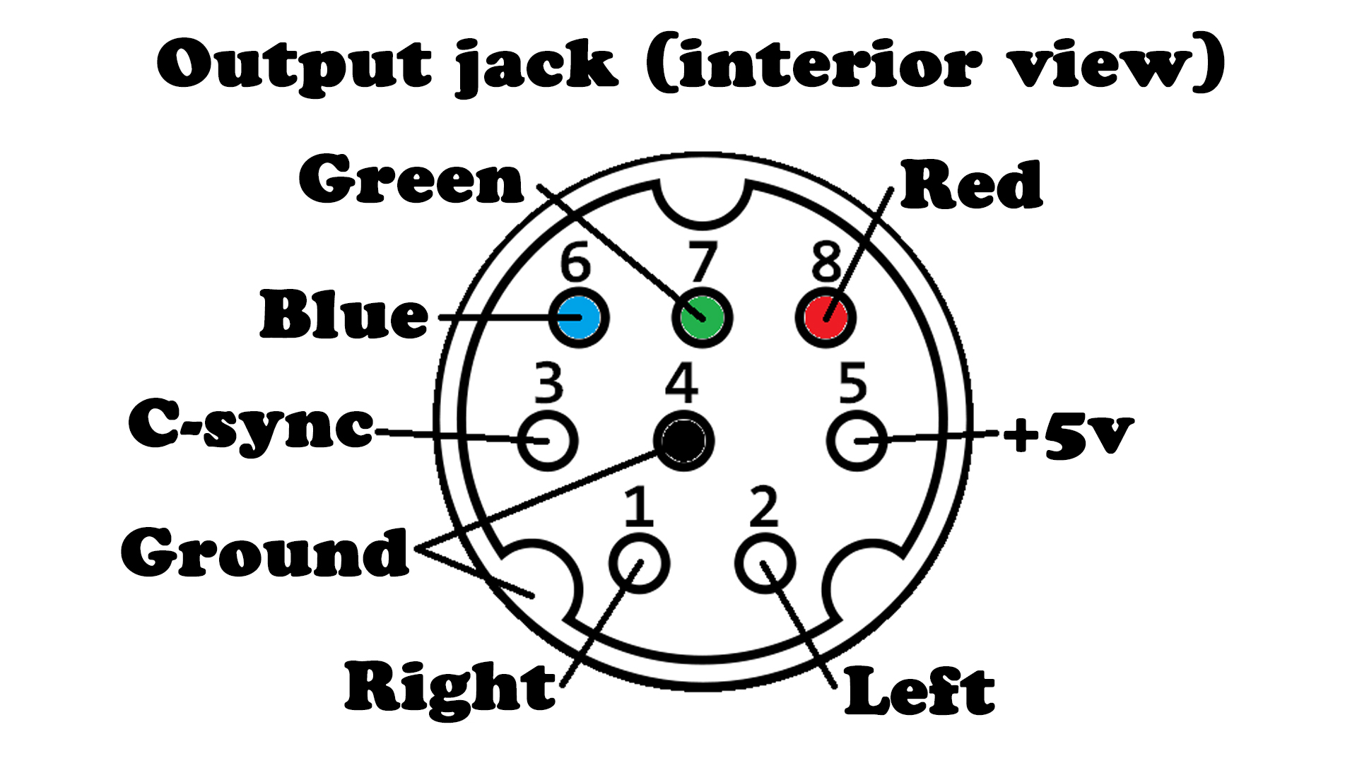 Wire up the RGB jack as shown. This is the view from the inside portion of the jack. Note that you do not need to connect 5v power to the jack, so you can leave that open. If you are using composite video as sync, connect that directly from the TG16 EXP port to the pin labeled c-sync on the RGB jack.