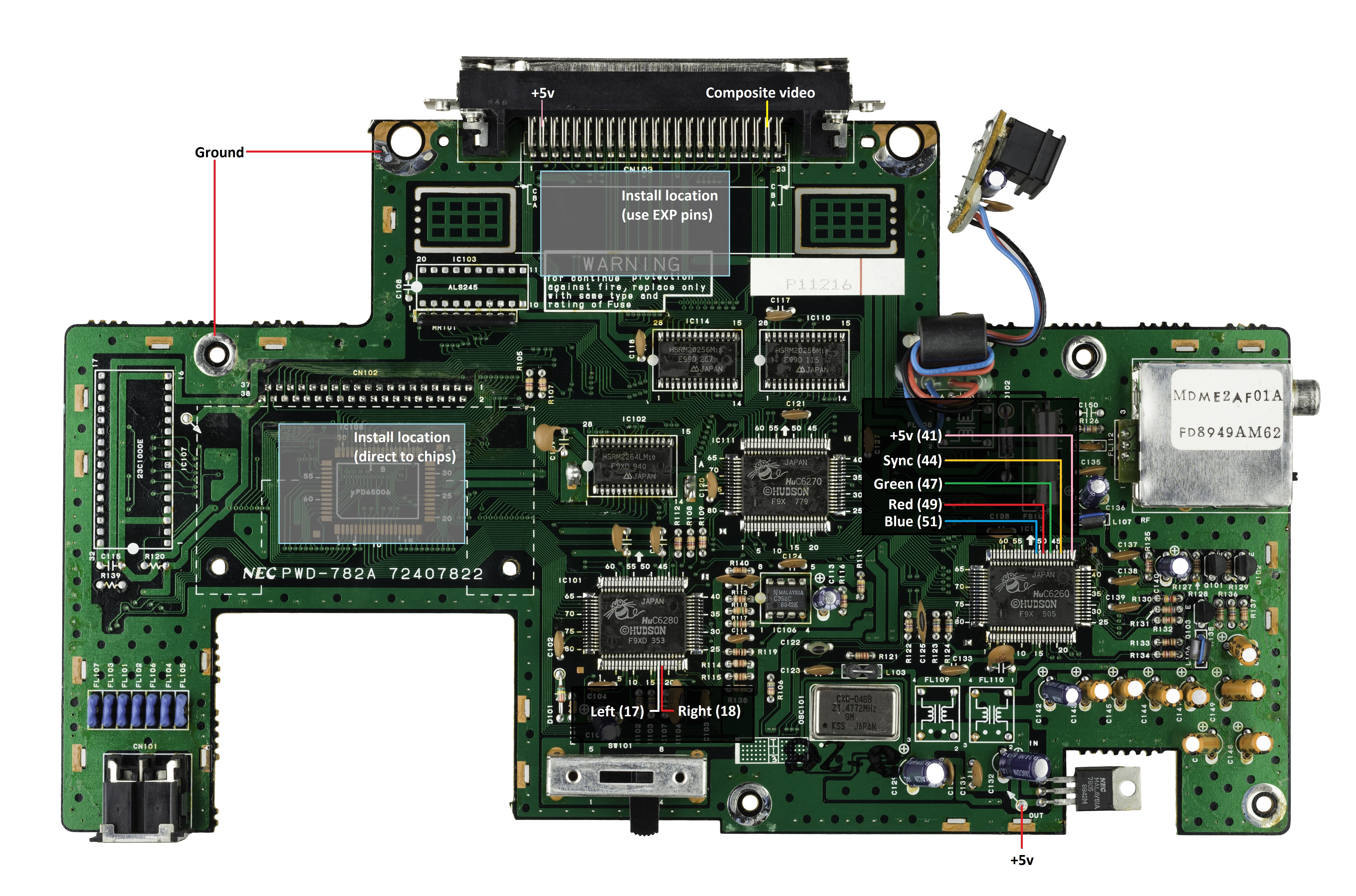 The top image shows where to connect your wires on the top side of the motherboard when connecting directly to the HU6260 and/or HU6280. The bottom image shows where to connect wires on the expansion port pins. Choose whichever is more convenient for you, though I generally recommend using the expansion port option as you are less likely to pull up critical traces by accident. If you are using composite video for sync, you will need to pull this from the expansion port. Pulling power and composite video from the top of the board may help reduce interference by keeping the wires away from other signal lines, so I have also indicated those connections.