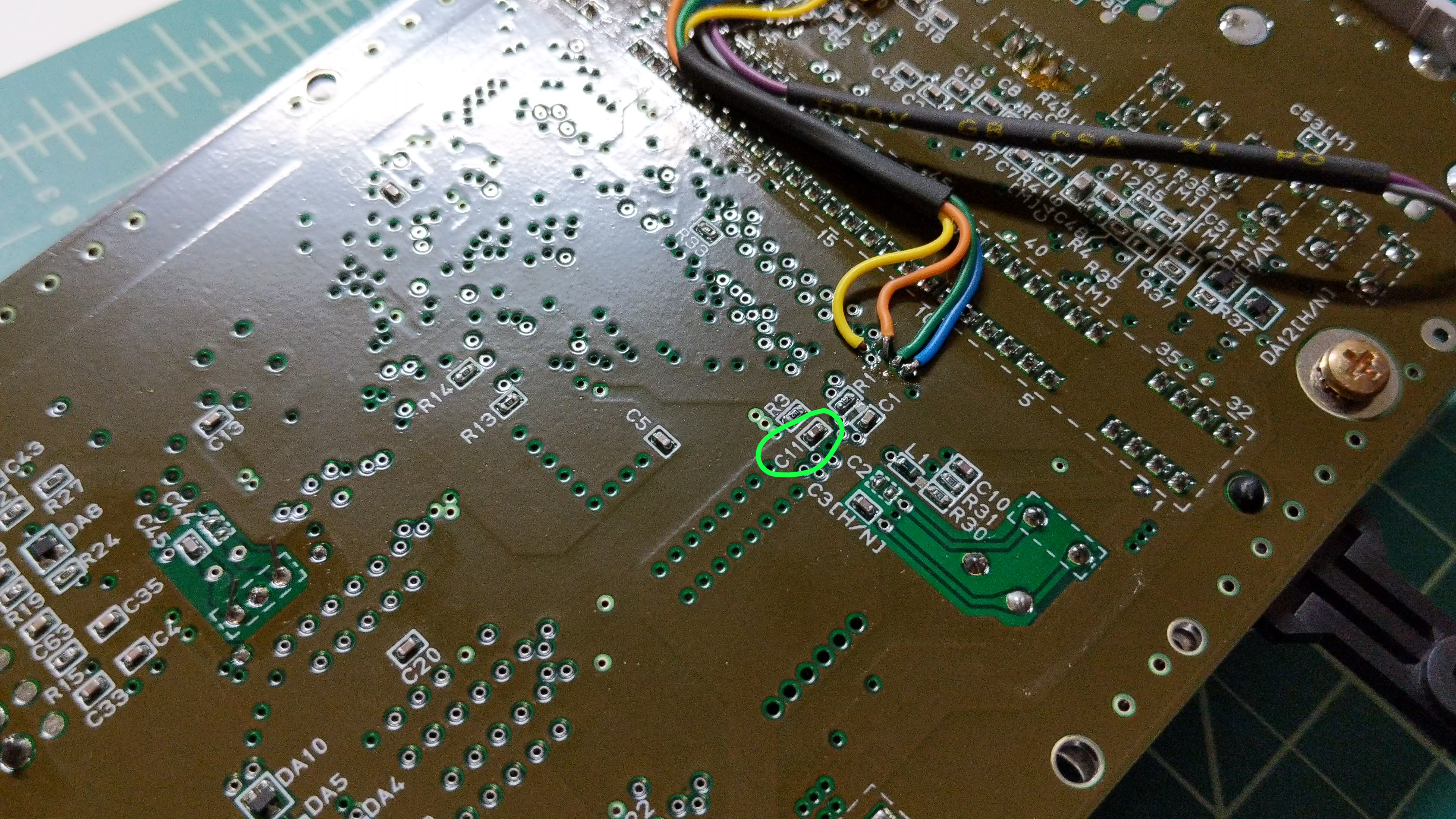 These steps apply to the SNES Jr. The general procedure applies to the “fat” model as well, but the specifics may need to be added. First, open your console, following the appropriate disassembly guide as needed. Remove the circuit board from the case and flip it over. Look for the capacitor labeled C11. For the Jr, you can see the location circled in this image (the wires are part of an RGB mod).