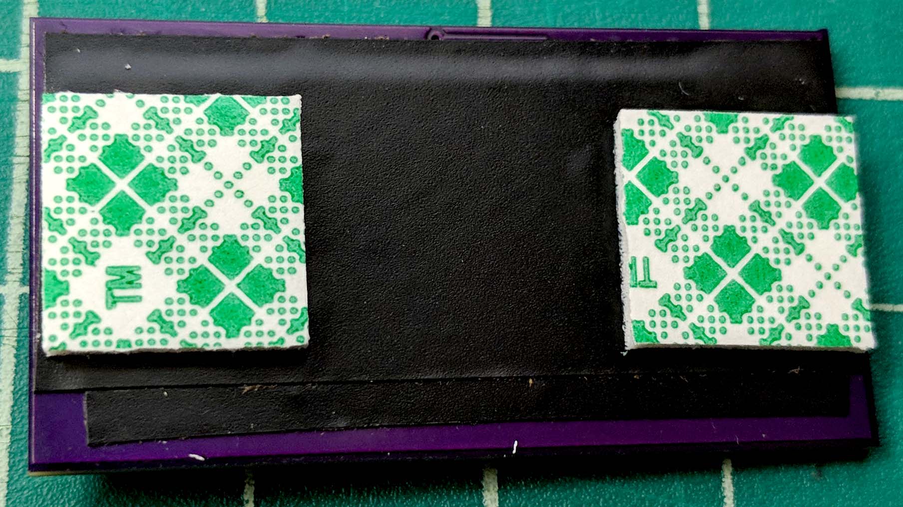 Flip the PCB over and put some electrical tape over the back. Make sure that no metal is left uncovered. You may want to trim the legs of the oscillator if they stick out so that they don’t pierce the tape. Attach mounting tape to the underside of the board.