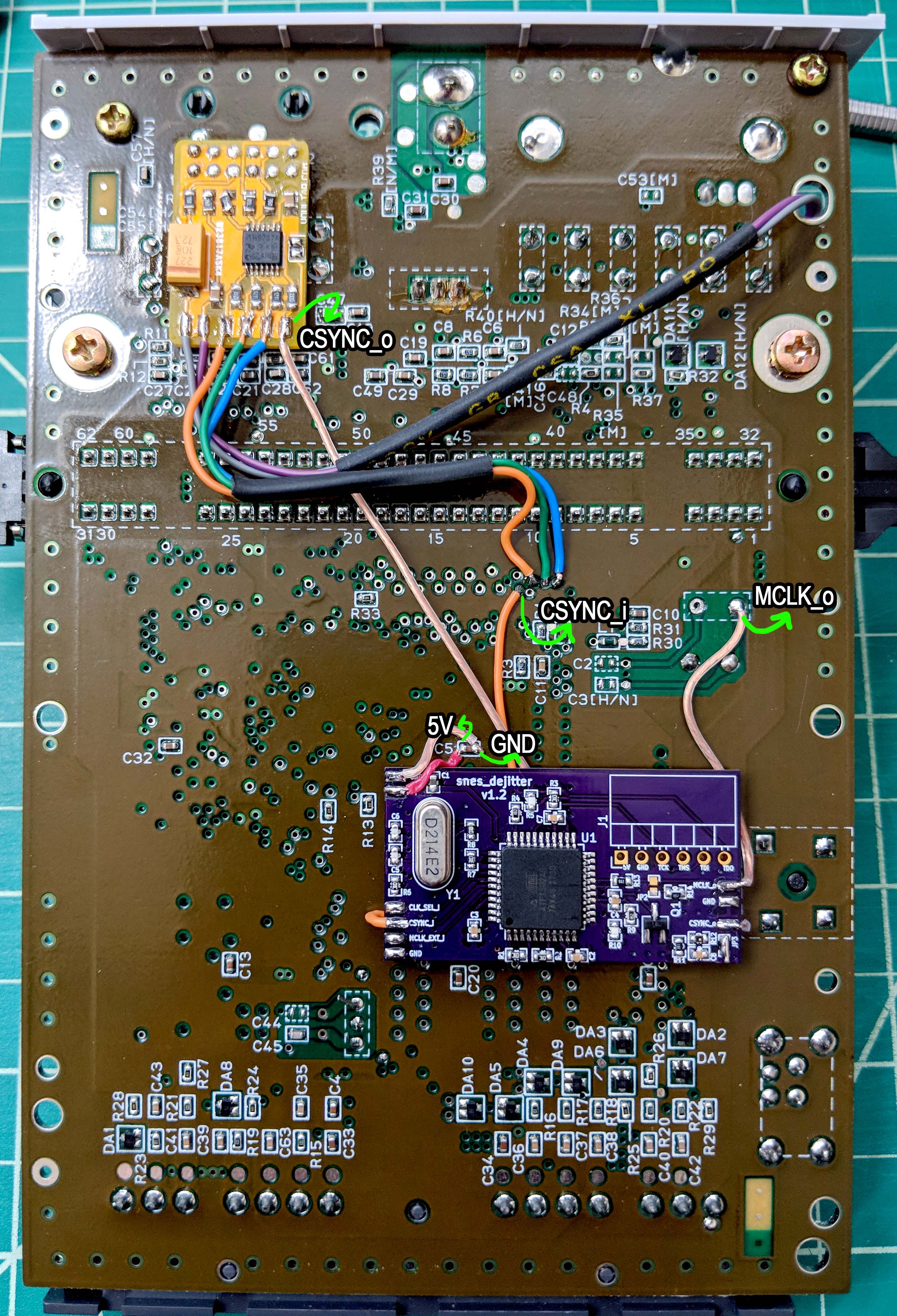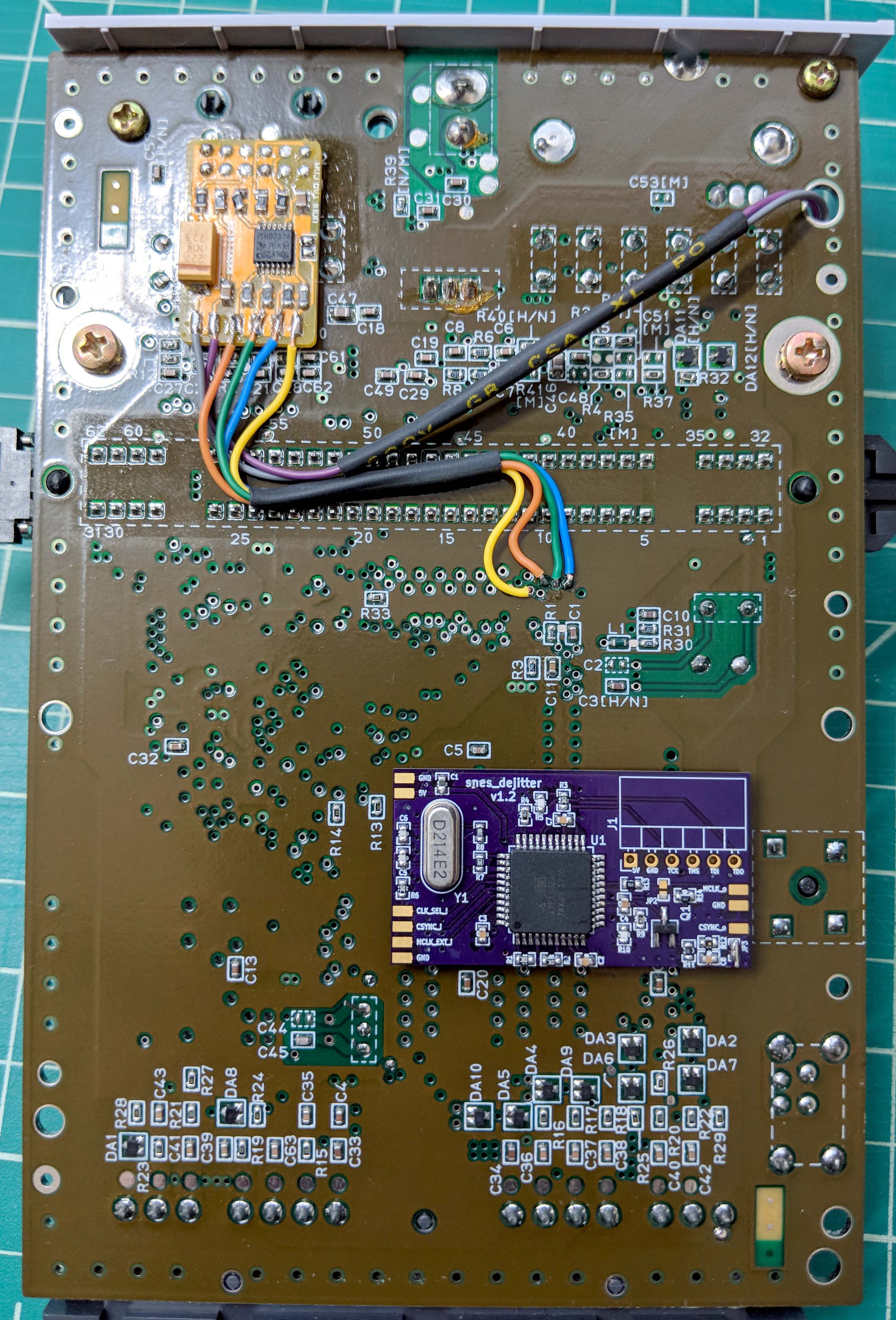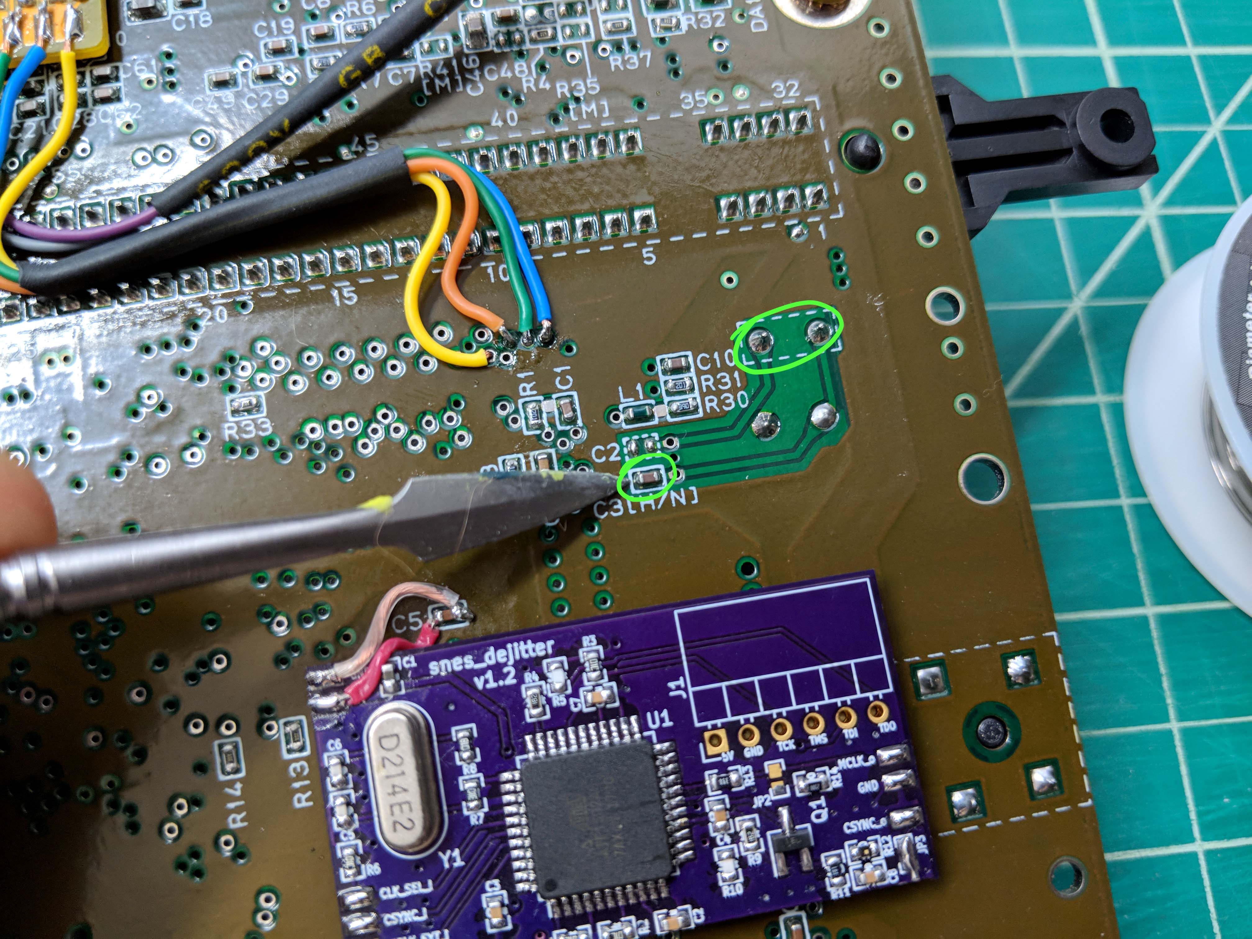 Note that this guide shows the console with an RGB bypass. On the dejitter PCB, close the JP3 jumper. I had to use a small bit of wire to bridge the gap. You may also want to flow a bit of solder onto the other pads at this point. If you are using an older version of the mod (older than version 1.2), remove R14 instead.